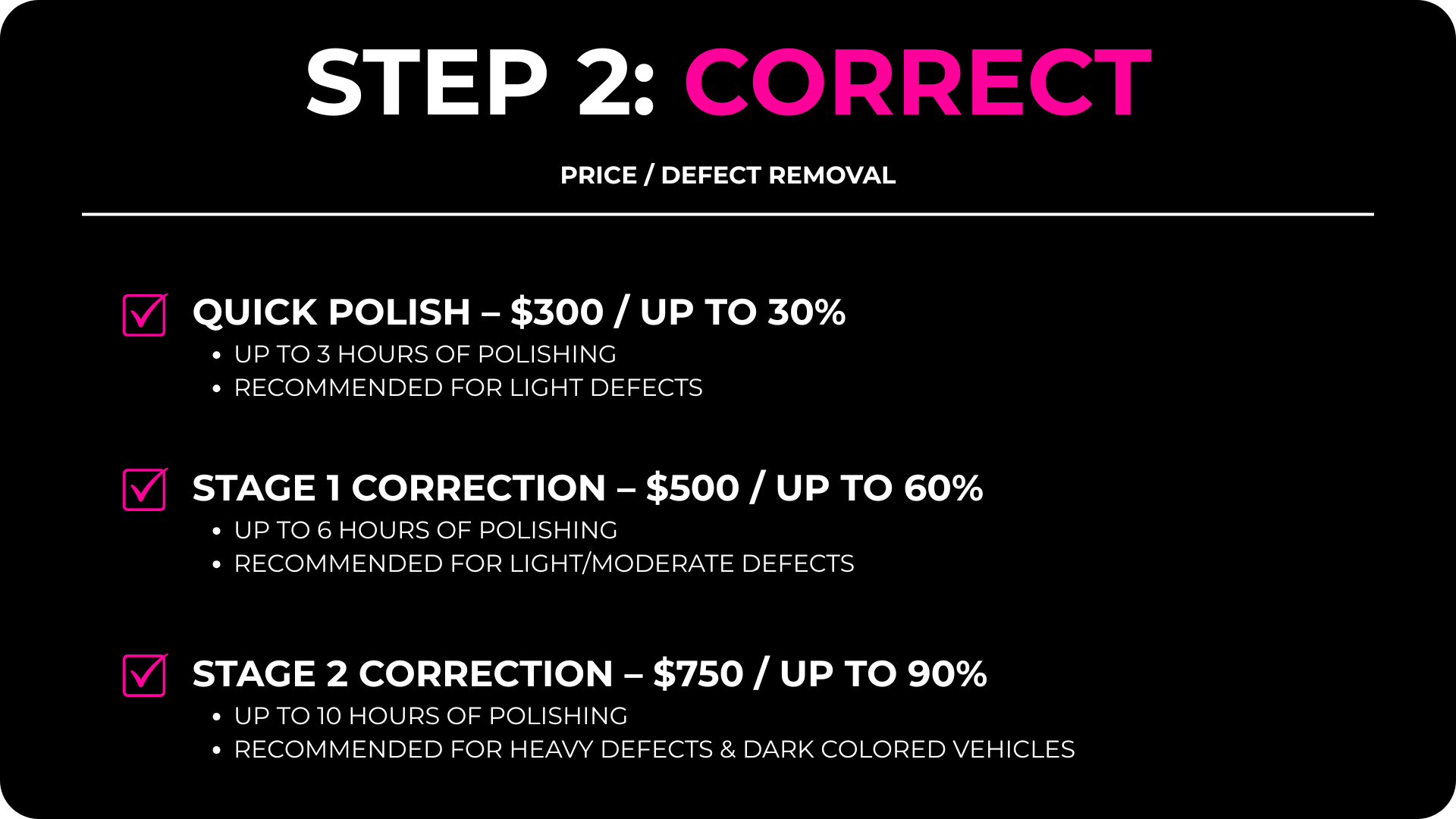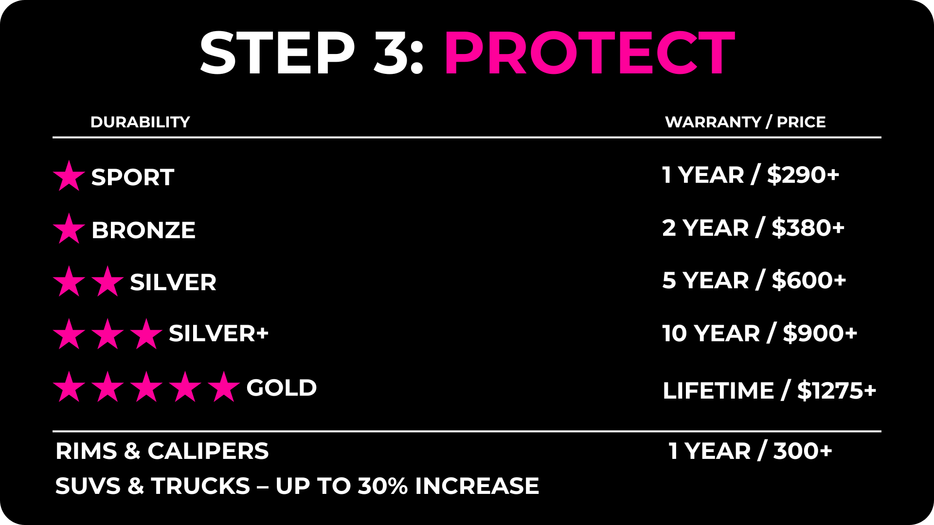 Our packages include professional-grade coatings that are registered to your VIN and backed by warranty options of up to 10 years. Whether you're protecting a daily driver, weekend cruiser, or your newest build, we’ll walk you through the entire process — from paint prep to post-install care.